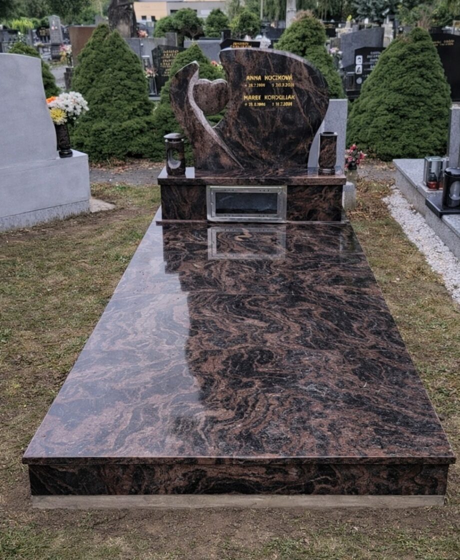 Hnědý žulový jednohrob s moderním dvojdílným náhrobkem – Kamenictví Karviná -