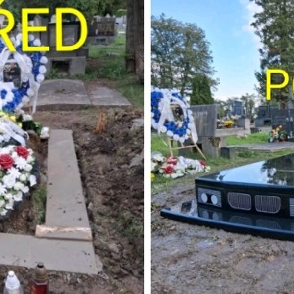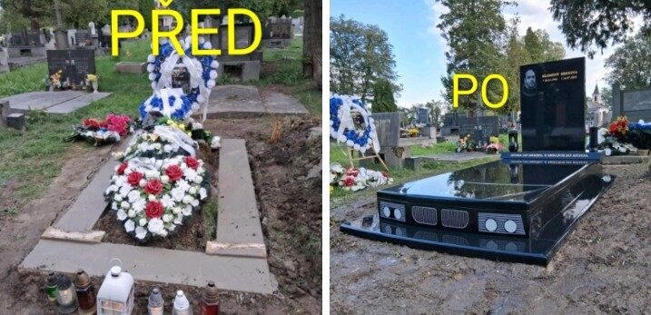 Ukázka zakázkové práce: hrob s motivem automobilu BMW. Realizace proběhla na přání rodiny -